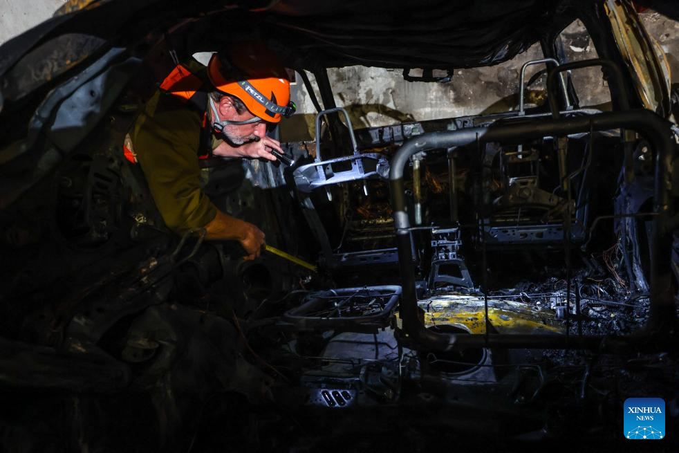 A member of Israeli security and rescue force works at the site of a rocket attack launched from Lebanon, in Nahariya, northern Israel, March 26, 2026. A man was killed and another severely injured when a rocket from Lebanon hit the city of Nahariya in northern Israel on Thursday afternoon, according to Israel's Magen David Adom ambulance service. (JINI via Xinhua)