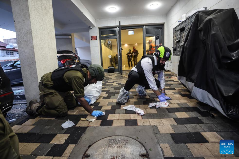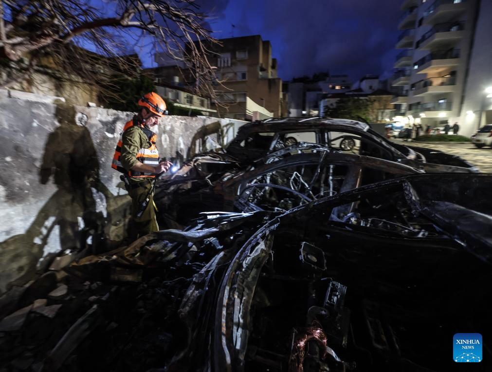 Israeli security and rescue forces work at the site of a rocket attack launched from Lebanon, in Nahariya, northern Israel, March 26, 2026. A man was killed and another severely injured when a rocket from Lebanon hit the city of Nahariya in northern Israel on Thursday afternoon, according to Israel's Magen David Adom ambulance service. (JINI via Xinhua)