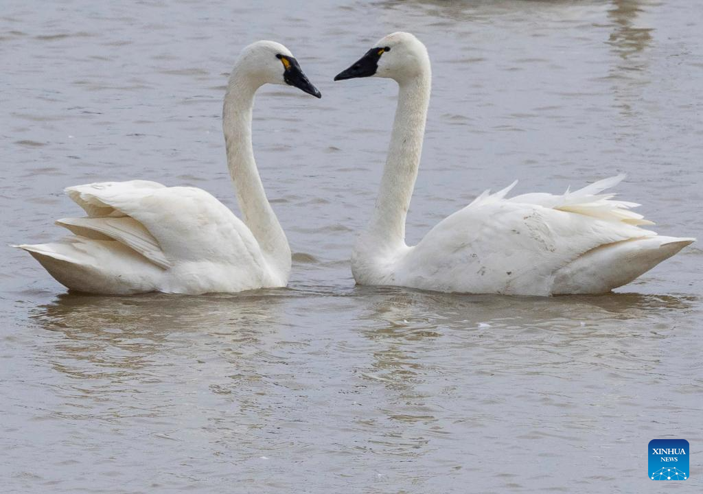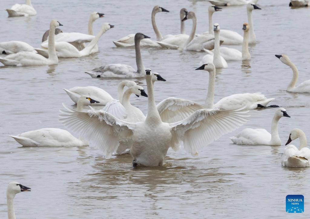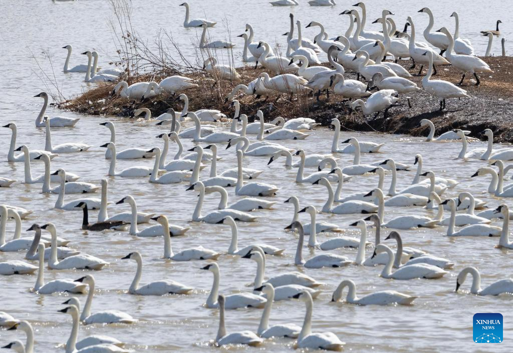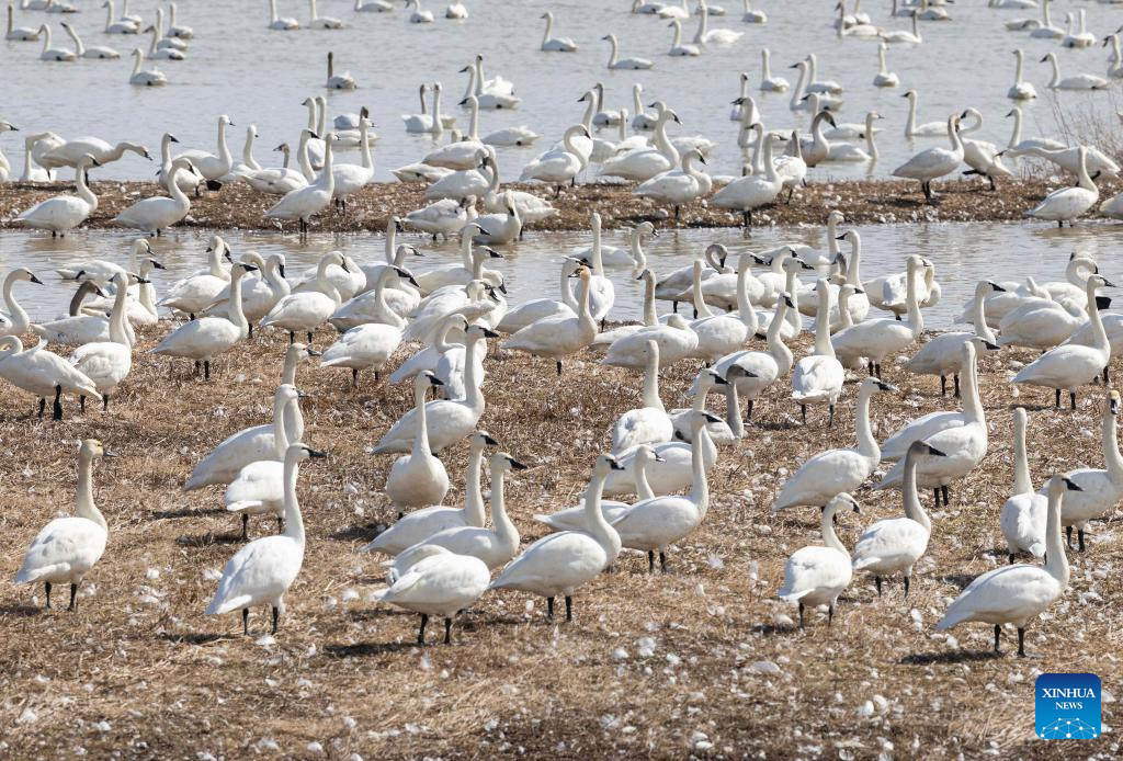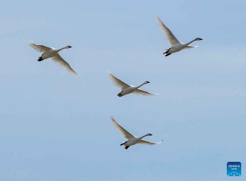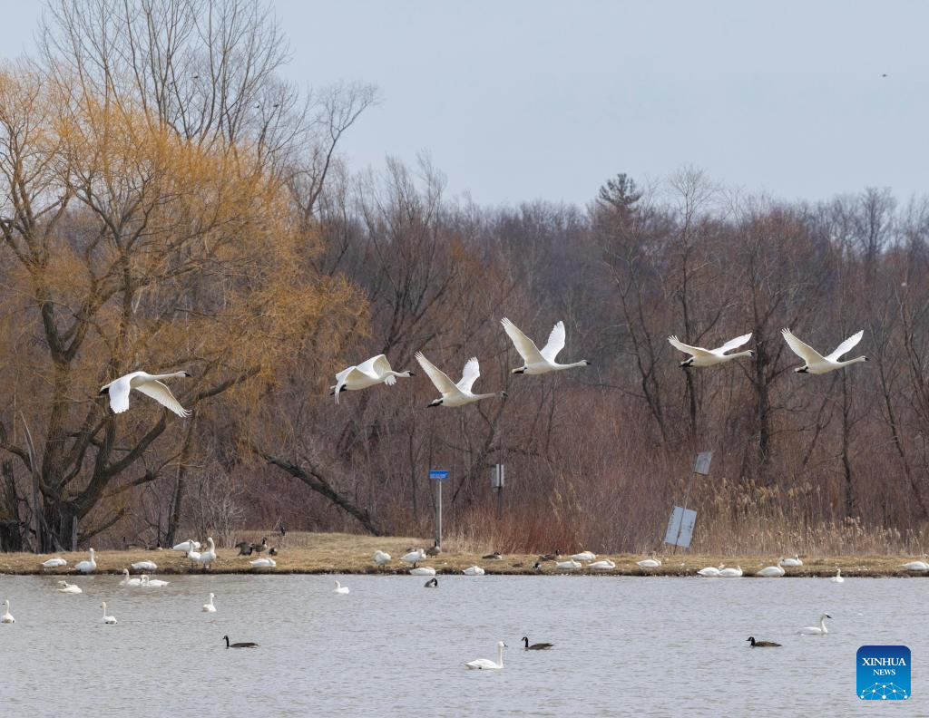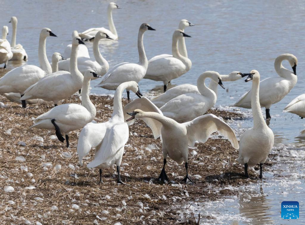 Tundra swans are seen at the Aylmer Wildlife Management Area in Aylmer, Ontario, Canada, on March 25, 2026. From February to April every year, thousands of wild tundra swans use Ontario's Aylmer Wildlife Management Area to refuel their migration to the high Arctic Region. (Photo by Zou Zheng/Xinhua)