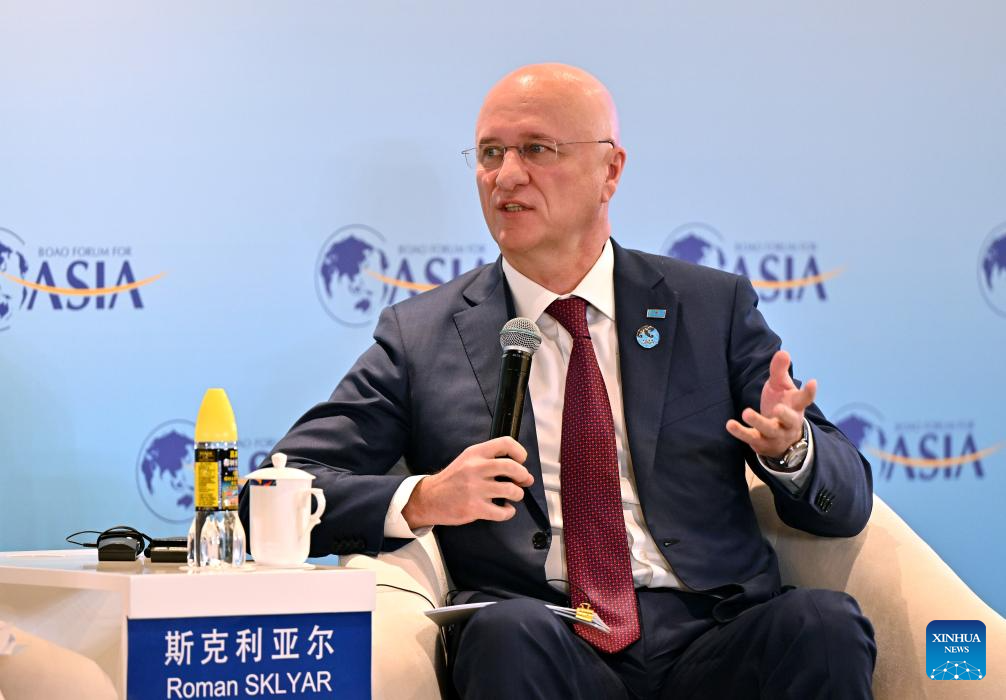 Kazakhstan's First Deputy Prime Minister Roman Sklyar speaks at high-level dialogues themed on "Injecting Certainty into an Uncertain World" during the Boao Forum for Asia (BFA) Annual Conference 2026 in Boao, south China's Hainan Province, March 25, 2026. (Xinhua/Guo Cheng)