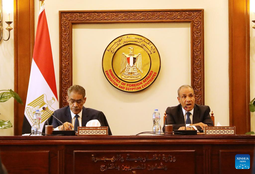 Egyptian Foreign Minister Badr Abdelatty (R) speaks at a press conference at the Ministry of Foreign Affairs headquarters in the New Administrative Capital, Egypt, March 25, 2026.(Xinhua/Xu Haofu)