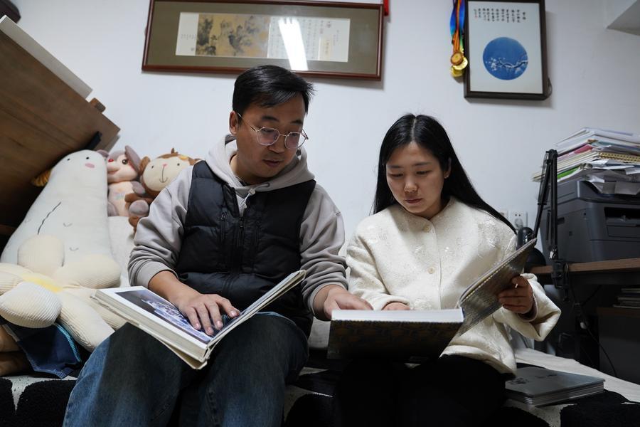 Cao Lang (L) and Hu Yunyue read for patterns of porcelain at their studio in Jingdezhen, east China's Jiangxi Province, March 11, 2026. (Xinhua/Zhou Mi)