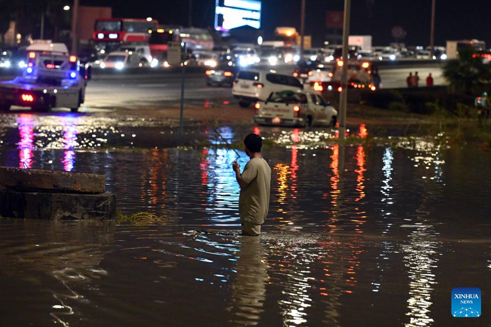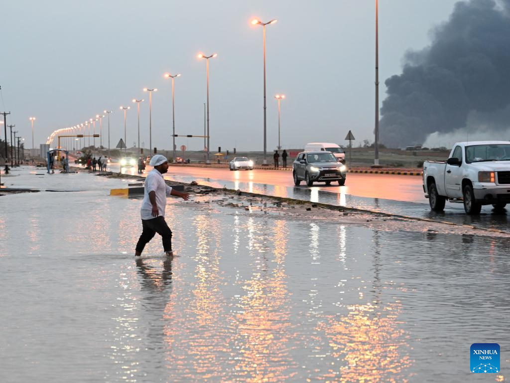 A man crosses a flooded street after heavy rain in Mubarak Al-Kabeer Governorate, Kuwait, March 25, 2026. Heavy rainfall and unstable weather conditions affected several parts of Kuwait on Wednesday. (Photo by Asad/Xinhua)