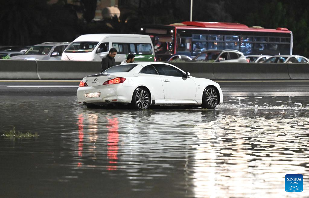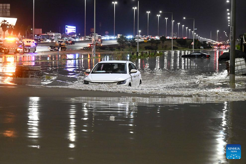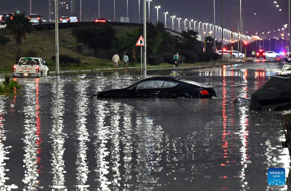 A car is stranded in water after heavy rain in Mubarak Al-Kabeer Governorate, Kuwait, March, 25, 2026. Heavy rainfall and unstable weather conditions affected several parts of Kuwait on Wednesday. (Photo by Asad/Xinhua)