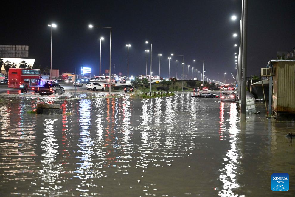Cars are seen in a flooded street after heavy rain in Mubarak Al-Kabeer Governorate, Kuwait, March 25, 2026. Heavy rainfall and unstable weather conditions affected several parts of Kuwait on Wednesday. (Photo by Asad/Xinhua)