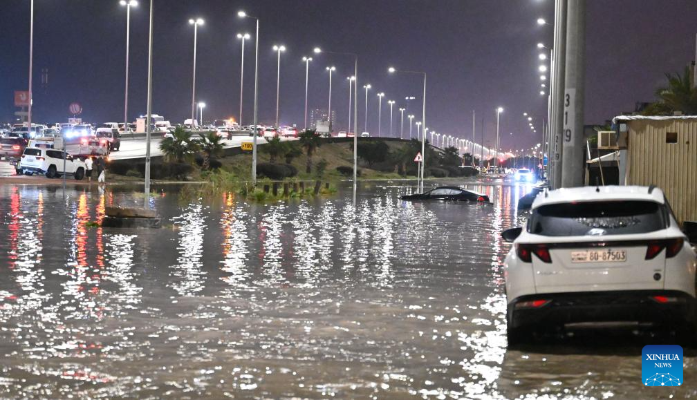 Cars are stranded and submerged in water after heavy rain in Mubarak Al-Kabeer Governorate, Kuwait, March 25, 2026. Heavy rainfall and unstable weather conditions affected several parts of Kuwait on Wednesday. (Photo by Asad/Xinhua)