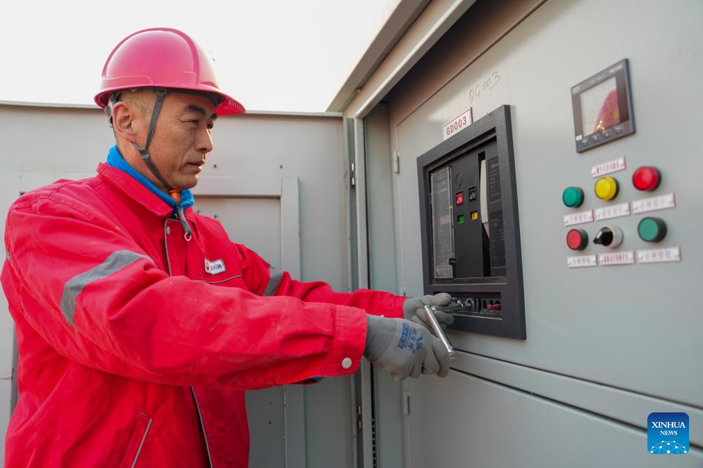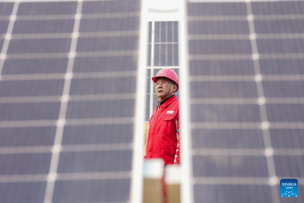 A technician inspects the photovoltaic power generation equipment at the low-carbon demonstration zone of Lamadian Oilfield in Daqing, northeast China's Heilongjiang Province, March 25, 2026. As an important energy production base in China, Daqing Oilfield has been exploring new pathways for green transformation and development in recent years. While maintaining stable production of traditional energy, it has actively promoted the construction of photovoltaic, wind power and geothermal energy projects. (Xinhua/Wang Song)