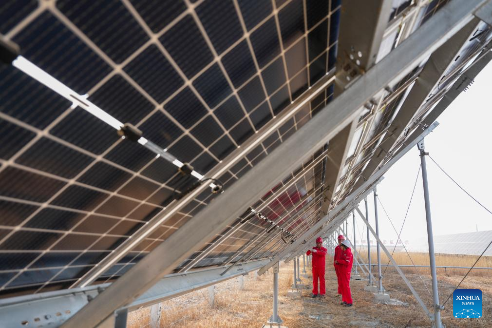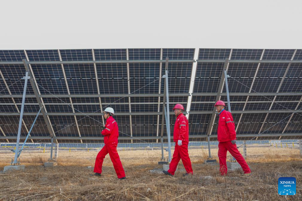 Technicians inspect the photovoltaic power generation equipment at the low-carbon demonstration zone of Lamadian Oilfield in Daqing, northeast China's Heilongjiang Province, March 25, 2026. As an important energy production base in China, Daqing Oilfield has been exploring new pathways for green transformation and development in recent years. While maintaining stable production of traditional energy, it has actively promoted the construction of photovoltaic, wind power and geothermal energy projects. (Xinhua/Wang Song)