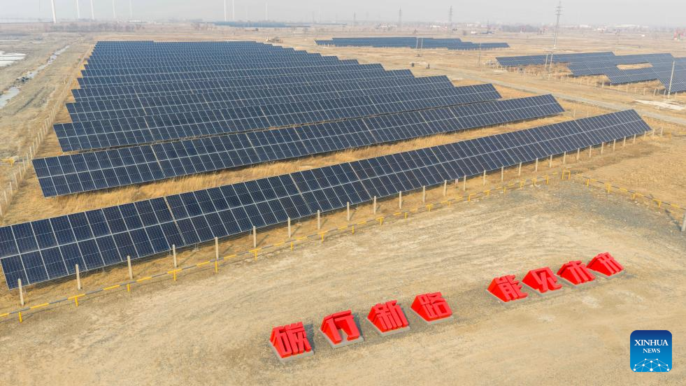 An aerial drone photo taken on March 25, 2026 shows the photovoltaic panels at the low-carbon demonstration zone of Lamadian Oilfield in Daqing, northeast China's Heilongjiang Province. As an important energy production base in China, Daqing Oilfield has been exploring new pathways for green transformation and development in recent years. While maintaining stable production of traditional energy, it has actively promoted the construction of photovoltaic, wind power and geothermal energy projects. (Xinhua/Wang Song)