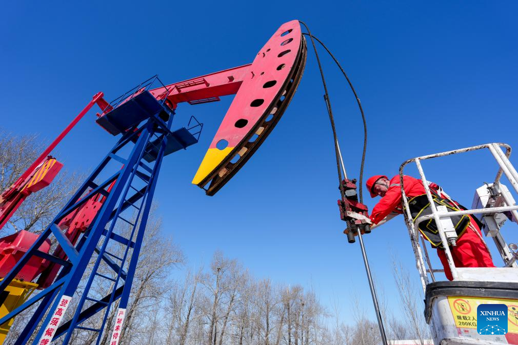 A worker maintains a pumpjack at Daqing Oilfield in Daqing, northeast China's Heilongjiang Province, March 6, 2026. As an important energy production base in China, Daqing Oilfield has been exploring new pathways for green transformation and development in recent years. While maintaining stable production of traditional energy, it has actively promoted the construction of photovoltaic, wind power and geothermal energy projects. (Xinhua/Wang Song)