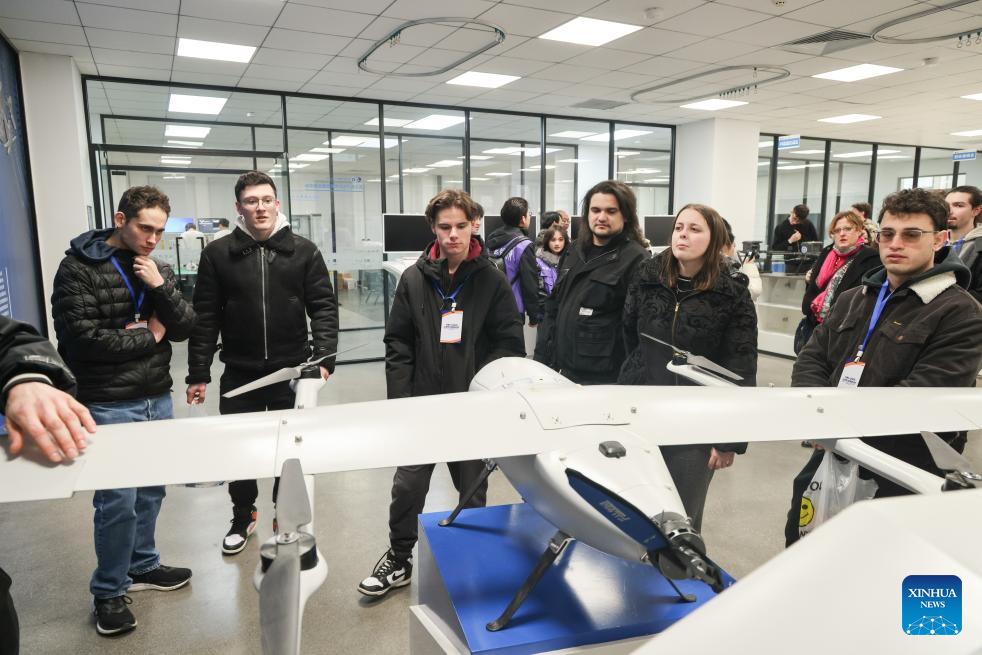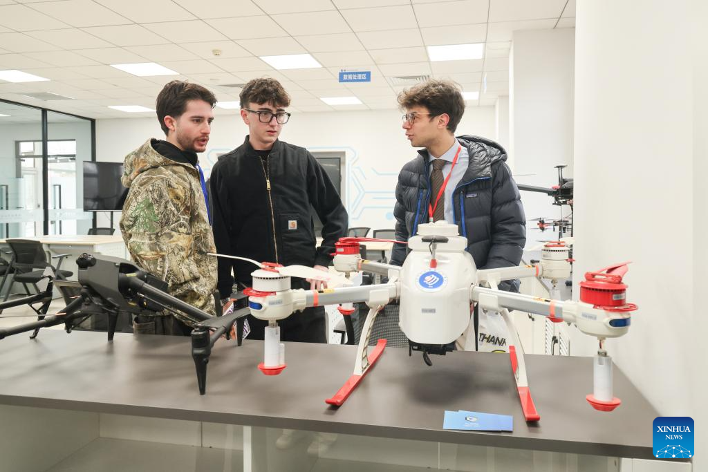 Students from Italy's Jobs Academy Foundation look at a drone displayed at Tianjin Modern Vocational Technology College in north China's Tianjin Municipality, March 16, 2026. (Tianjin Modern Vocational Technology College/Handout via Xinhua)