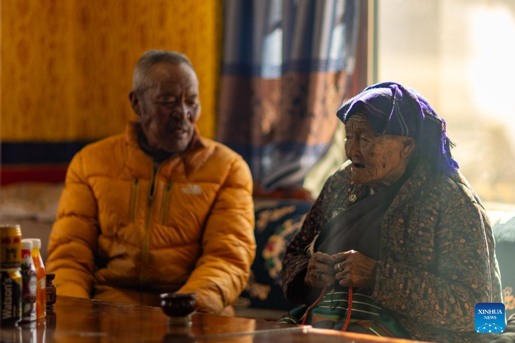 Konjo Chodron (R) talks with her son at home in Nyemo County, Lhasa City, southwest China's Xizang Autonomous Region, March 6, 2026. (Xinhua/Jiang Fan)