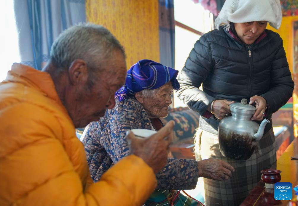Konjo Chodron (C) drinks tea with her family at home in Nyemo County, Lhasa City, southwest China's Xizang Autonomous Region, March 6, 2026. (Xinhua/Jigme Dorje)
