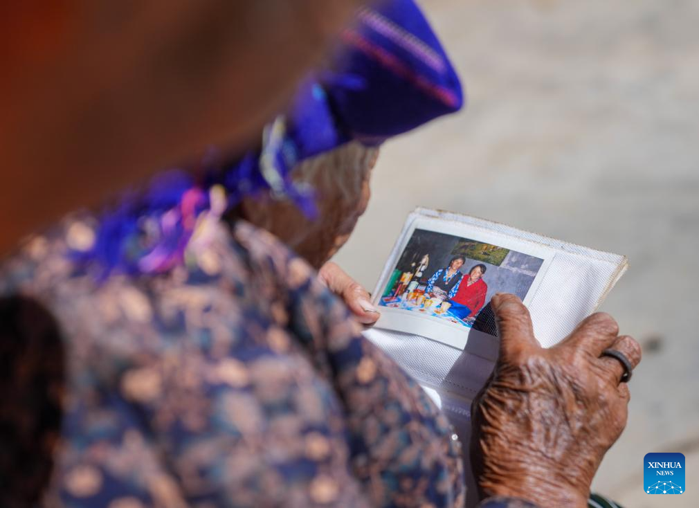 Konjo Chodron looks at a picture at home in Nyemo County, Lhasa City, southwest China's Xizang Autonomous Region, March 6, 2026. (Xinhua/Jigme Dorje)
