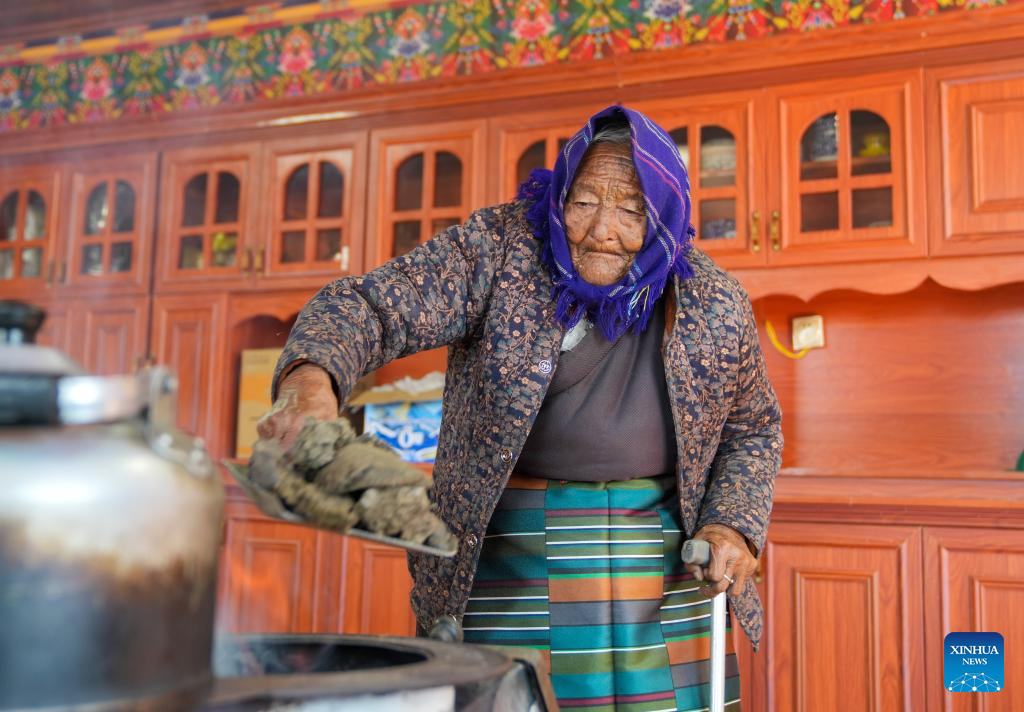 Konjo Chodron adds fuel to a stove at home in Nyemo County, Lhasa City, southwest China's Xizang Autonomous Region, March 6, 2026. (Xinhua/Jigme Dorje)