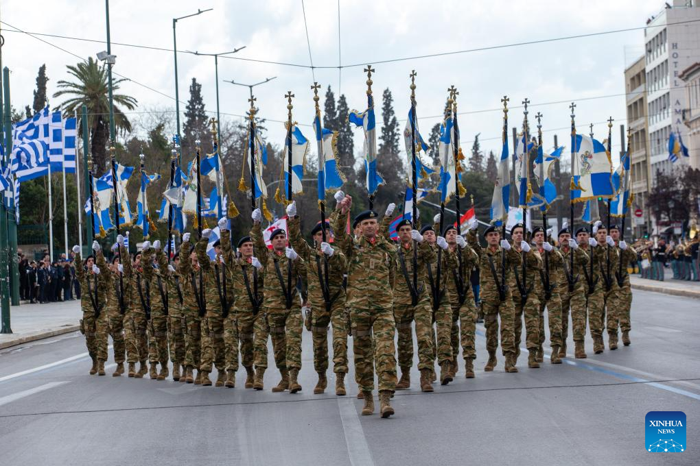 (260326) -- ATHENS, March 26, 2026 (Xinhua) -- Soldiers march in formation during a military parade commemorating the Greek Independence Day in Athens, Greece, March 25, 2026. Greece commemorated its Independence Day with a military parade in Athens on Wednesday. (Xinhua/Marios Lolos)