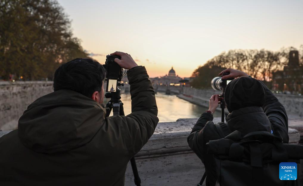 People take photos of sunset along the Tiber River in Rome, capital of Italy, March 25, 2026. (Xinhua/Wang Kaiyan)