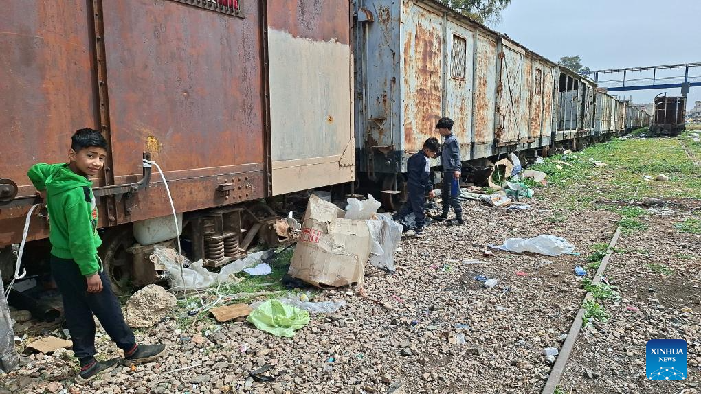This photo taken with a mobile phone shows children at a railway yard in Daraa, southern Syria, March 14, 2026.(Str/Xinhua)