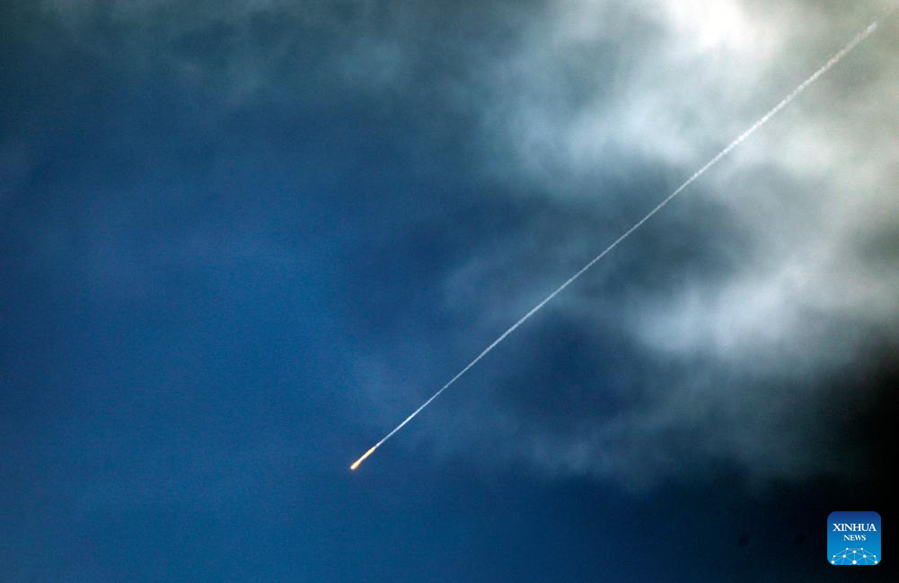 A trail left by a projectile in the sky is seen from the city of Hebron in the West Bank amid regional tensions, March 25, 2026. (Photo by Mamoun Wazwaz/Xinhua)