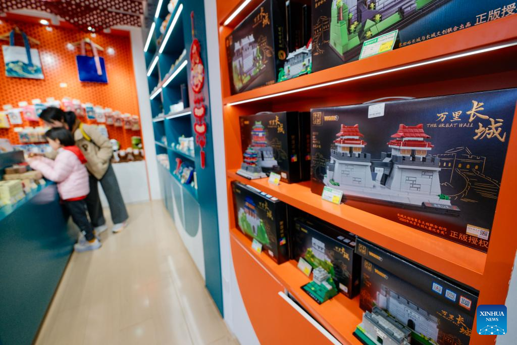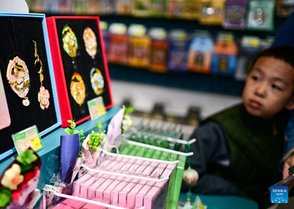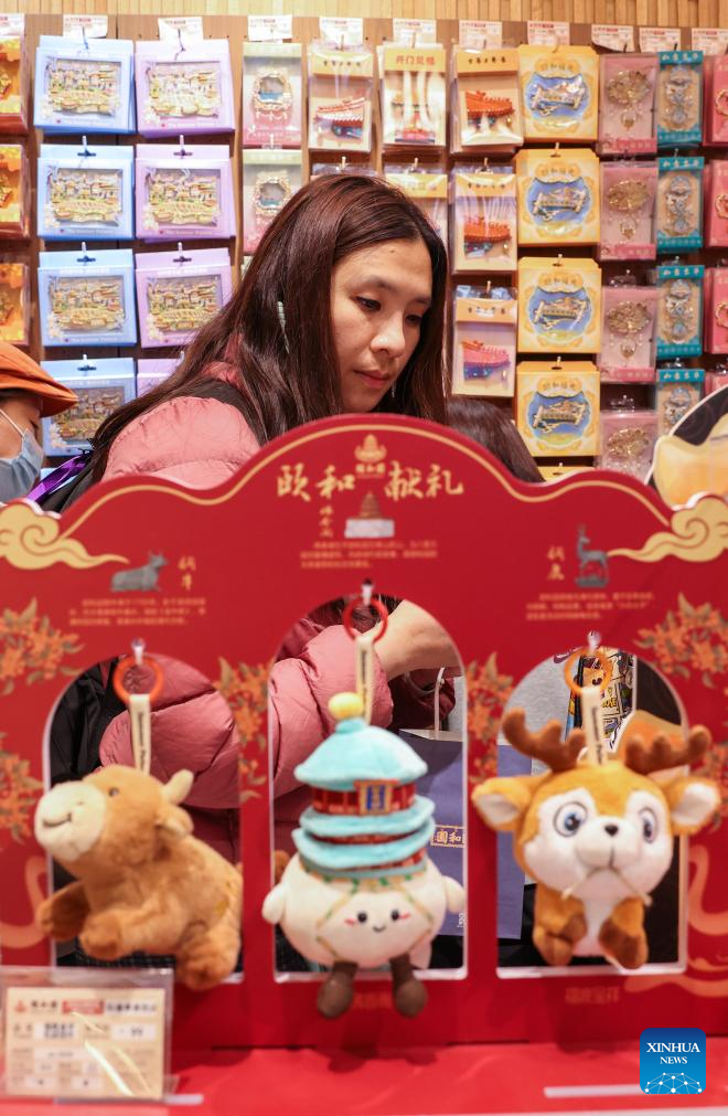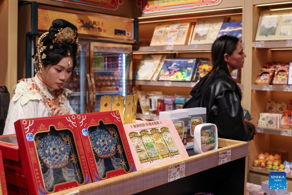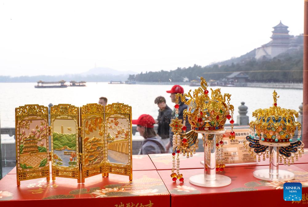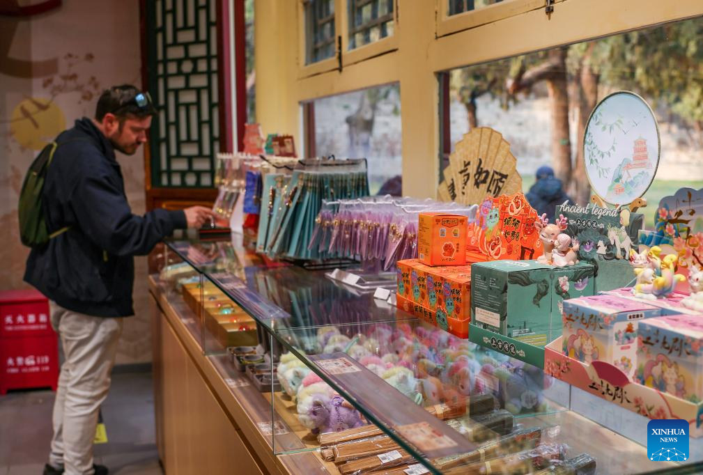 Cultural and creative products are pictured at a shop at the Summer Palace in Beijing, capital of China, March 23, 2026. As temperature rises, multiple parks and scenic spots in Beijing have held spring-themed fairs and launched cultural and creative products, giving a nice boost to the spring economy. (Xinhua/Zhang Fan)