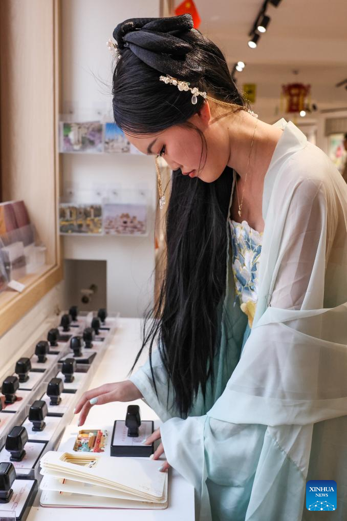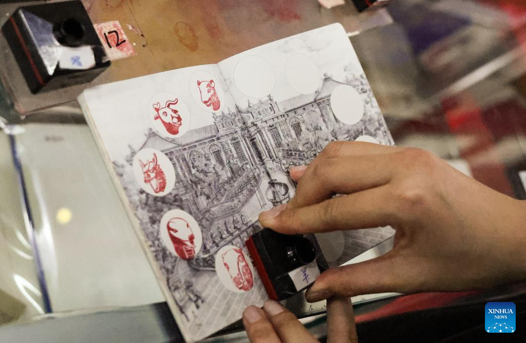 A tourist stamps a booklet at the Old Summer Palace (Yuanmingyuan) in Beijing, capital of China, March 23, 2026. As temperature rises, multiple parks and scenic spots in Beijing have held spring-themed fairs and launched cultural and creative products, giving a nice boost to the spring economy. (Xinhua/Zhang Fan)