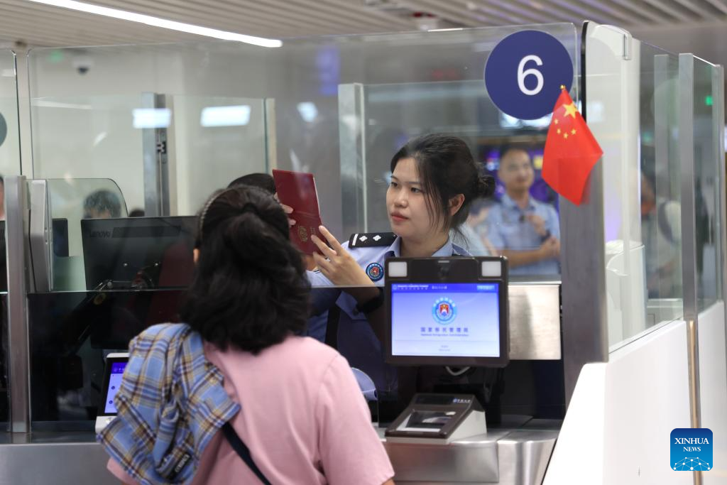 An inbound passenger goes through border control at Meilan International Airport in Haikou, south China's Hainan Province, March 27, 2026. The Hainan Free Trade Port (FTP), the world's largest free trade port by area, marks the 100th day of island-wide special customs operations on Friday. In the course of the past 100 days, the number of visa-free inbound passengers jumped by over 54 percent year on year. (Photo by Wang Yu/Xinhua)