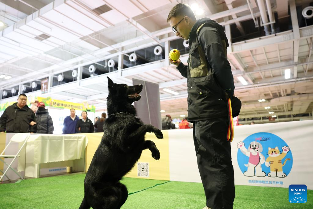 A dog trainer demonstrates dog training during a pet expo in Lanzhou, northwest China's Gansu Province, March 27, 2026. The three-day event kicked off here on Friday, attracting nearly 100 exhibitors from the pet industry to showcase various pets, as well as pet-related food, smart products, medical care services, clothing, photography and more on site. (Xinhua/Chen Bin)