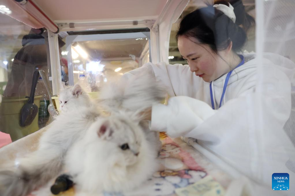 A staff member combs a pet cat during a pet expo in Lanzhou, northwest China's Gansu Province, March 27, 2026. The three-day event kicked off here on Friday, attracting nearly 100 exhibitors from the pet industry to showcase various pets, as well as pet-related food, smart products, medical care services, clothing, photography and more on site. (Xinhua/Chen Bin)
