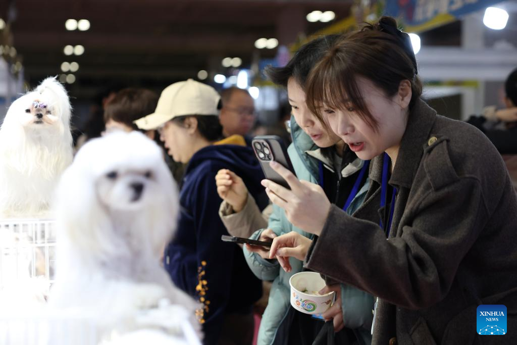 Visitors take photos of pet dogs during a pet expo in Lanzhou, northwest China's Gansu Province, March 27, 2026. The three-day event kicked off here on Friday, attracting nearly 100 exhibitors from the pet industry to showcase various pets, as well as pet-related food, smart products, medical care services, clothing, photography and more on site. (Xinhua/Chen Bin)