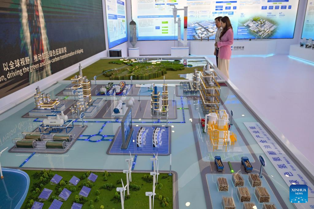 This photo shows a model of the entire industrial chain of green hydrogen, ammonia, methanol, and oil displayed at the China Energy Engineering Group Co., Ltd. pavilion in Boao, south China's Hainan Province, March 25, 2026. Since the Boao Forum for Asia (BFA) was established 25 years ago, the concept of green operations has remained a steadfast principle of its annual conferences. This year's conference has further deepened green practices throughout the process, integrating sustainable development into all aspects such as venue operations, transportation support, conference services, among others. (Xinhua/Guo Cheng)