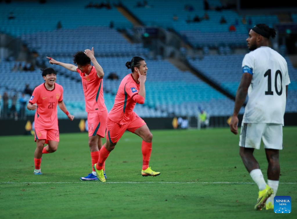 Zhang Yuning (2nd R) of China celebrates after scoring during the FIFA Series 2026 International Friendly Match between China and Curacao in Sydney, Australia, March 27, 2026. (Xinhua/Ma Ping)