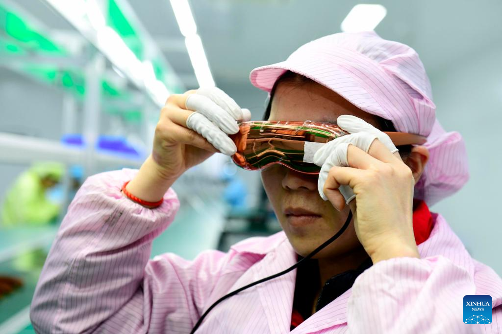 A staff member adjusts a VR glasses in Wulian County of Rizhao City, east China's Shandong Province, March 26, 2026. Rizhao has vigorously advanced technological upgrading initiatives, continuously promoting the transformation of traditional industries toward higher-end, intelligent, and green development, while fostering and expanding emerging and future-oriented industries, and striving to build a modern industrial system with distinctive port-based characteristics. (Xinhua/Guo Xulei)