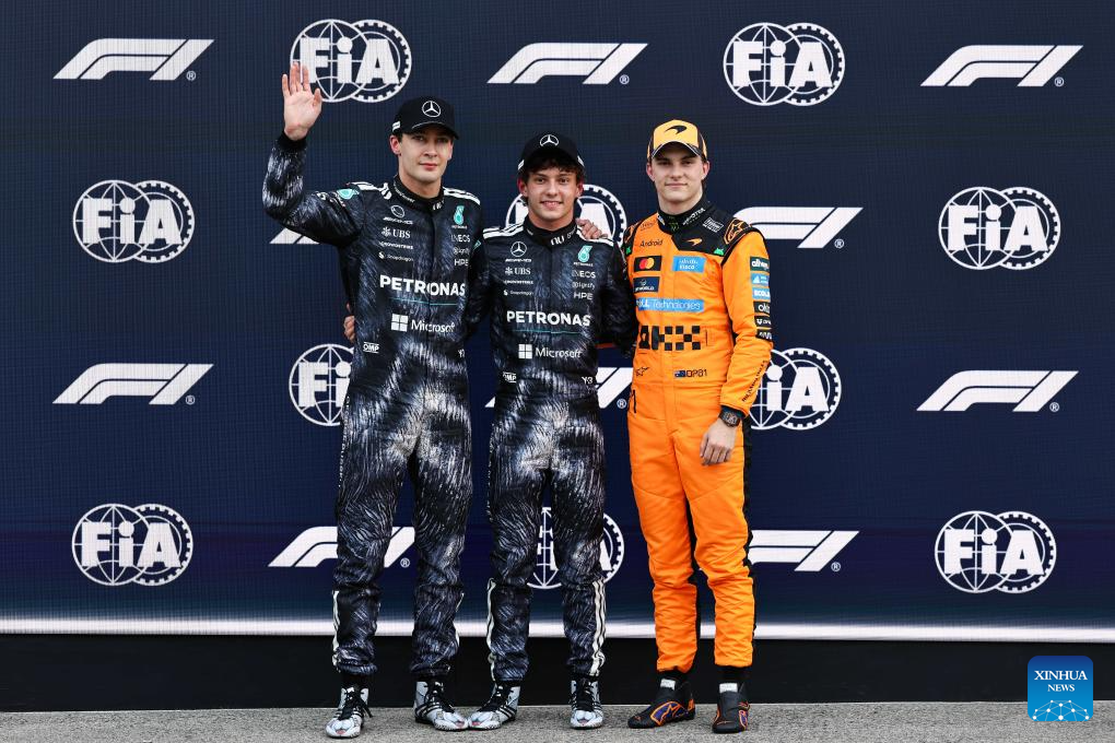 Mercedes' George Russell (L) of Britain, Mercedes' Kimi Antonelli (C) of Italy and McLaren's Oscar Piastri of Australia pose after the Qualifying Session of Formula One Japanese Grand Prix at Suzuka Circuit in Suzuka, Japan, March 28, 2026. (Photo by Li Chao/Xinhua)