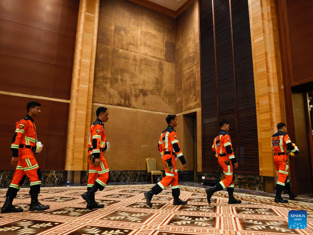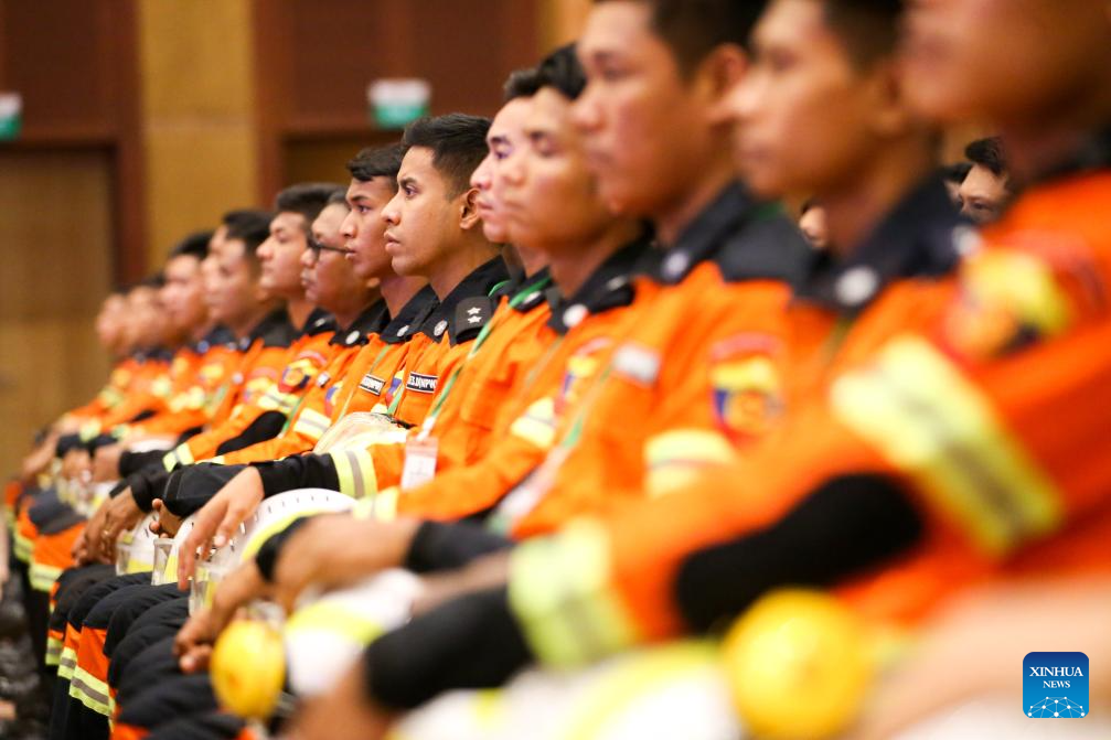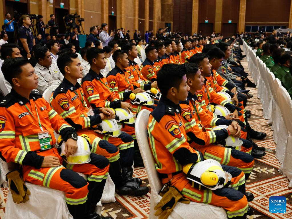 Rescuers attend a ceremony marking the one-year anniversary of the Mandalay earthquake in Nay Pyi Taw, Myanmar, March 28, 2026. A ceremony marking the one-year anniversary of the Mandalay earthquake that struck on March 28, 2025, was held in Myanmar's capital Nay Pyi Taw on Saturday, according to state-owned Myanmar Radio and Television. (Xinhua/Myo Kyaw Soe)