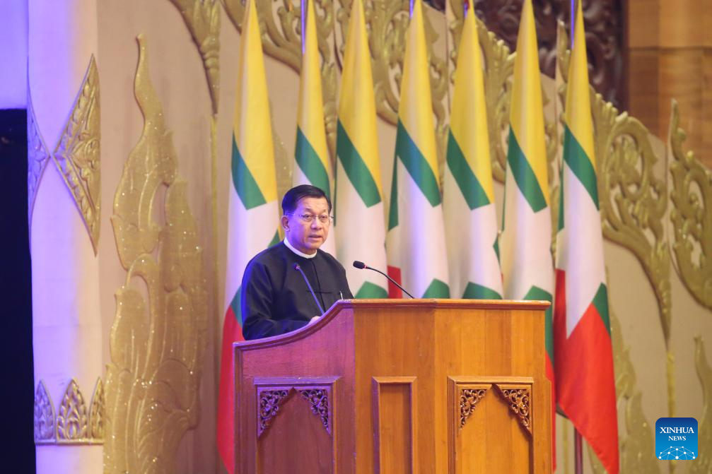 Myanmar's Acting President Senior General Min Aung Hlaing speaks during a ceremony marking the one-year anniversary of the Mandalay earthquake in Nay Pyi Taw, Myanmar, March 28, 2026. A ceremony marking the one-year anniversary of the Mandalay earthquake that struck on March 28, 2025, was held in Myanmar's capital Nay Pyi Taw on Saturday, according to state-owned Myanmar Radio and Television. (Xinhua/Myo Kyaw Soe)