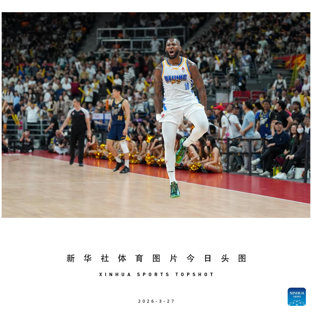 Eugene German of Beijing Ducks celebrates as he makes the game-winning shot at the buzzer after the 31th round regular season match between Guangdong Southern Tigers and Beijing Ducks at the 2025-2026 Chinese Basketball Association (CBA) league in Dongguan, south China's Guangdong Province, March 27, 2026. (Xinhua/Wu Lu)