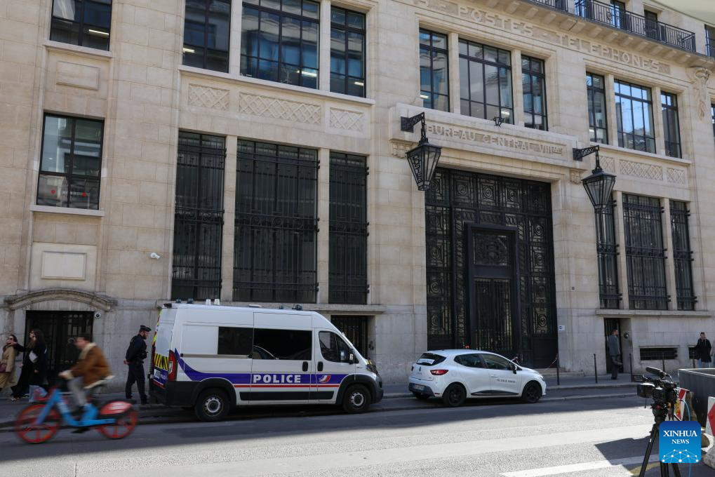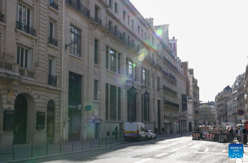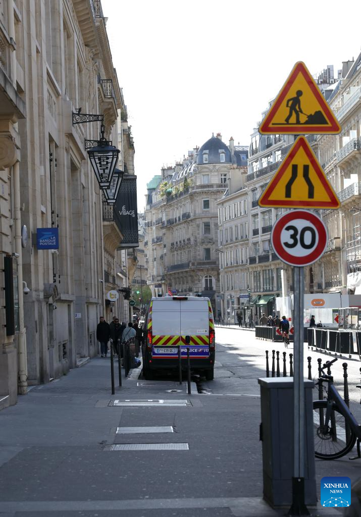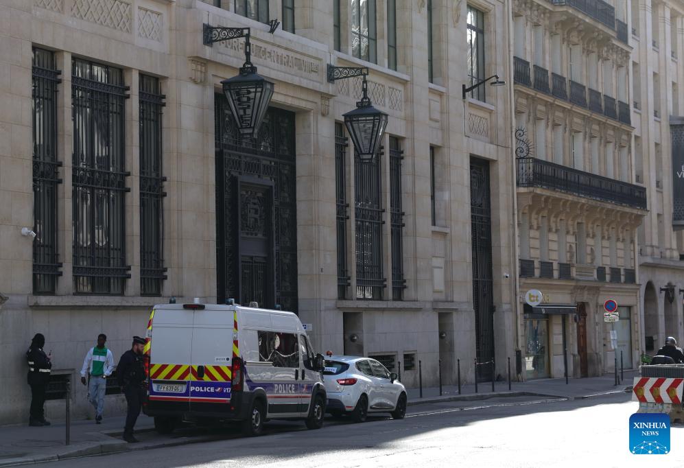 Policemen and police vehicles are seen near the branch of the Bank of America in Paris, France, March 28, 2026. An attempted bomb attack was foiled early Saturday outside the branch of the Bank of America in Paris, French media reported. (Xinhua/Wu Huiwo)