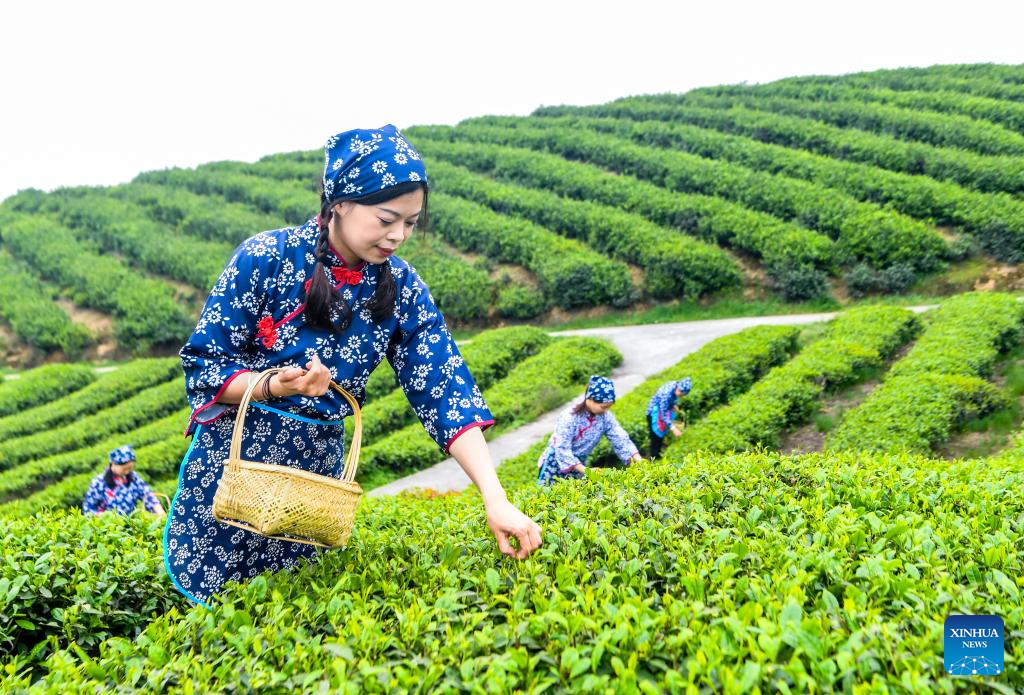 Farmers pick tea leaves in Rongchang District, southwest China's Chongqing, on March 27, 2026. The tea industry is a local specialty agricultural industry in Rongchang, and the planting area covers 43,000 mu (about 2866.67 hectares). As the weather warms up, tea gardens enter the peak picking season. (Xinhua/Tang Yi)