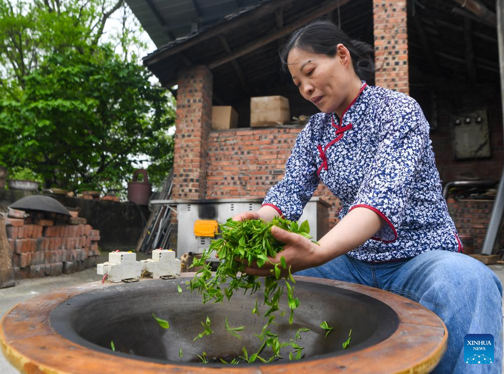 A tea maker manually processes tea leaves in Rongchang District, southwest China's Chongqing, on March 27, 2026. The tea industry is a local specialty agricultural industry in Rongchang, and the planting area covers 43,000 mu (about 2866.67 hectares). As the weather warms up, tea gardens enter the peak picking season. (Xinhua/Tang Yi)