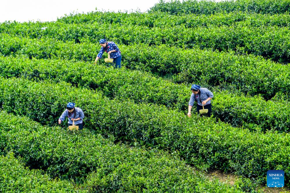 A drone photo taken on March 27, 2026 shows farmers picking tea leaves in Rongchang District, southwest China's Chongqing. The tea industry is a local specialty agricultural industry in Rongchang, and the planting area covers 43,000 mu (about 2866.67 hectares). As the weather warms up, tea gardens enter the peak picking season. (Xinhua/Tang Yi)