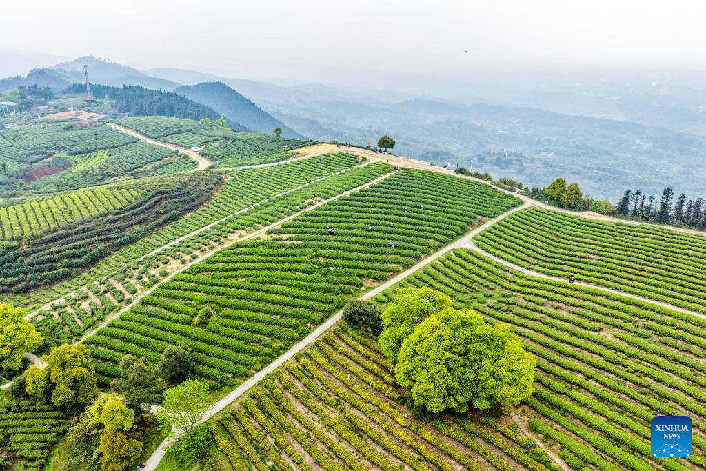 An aerial drone photo taken on March 27, 2026 shows a view of a tea garden in Rongchang District, southwest China's Chongqing. The tea industry is a local specialty agricultural industry in Rongchang, and the planting area covers 43,000 mu (about 2866.67 hectares). As the weather warms up, tea gardens enter the peak picking season. (Xinhua/Tang Yi)