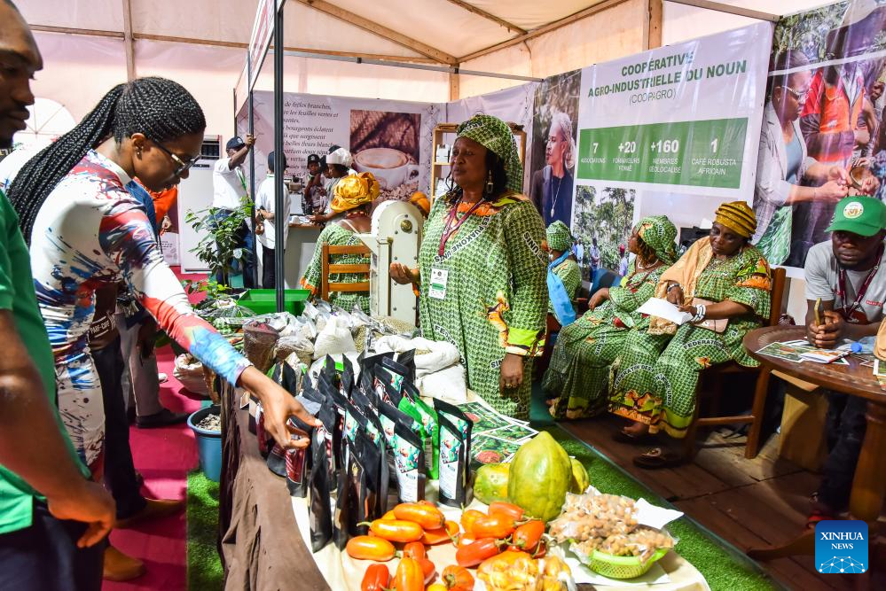 Exhibitors present cocoa and coffee products to visitors during the Cacao and Coffee Festival 2026 in Yaounde, Cameroon, March 27, 2026. Themed "the Woman at the Heart of the Sectors," the festival, held from March 26 to 28, highlighted women's strategic roles in cocoa and coffee industries. (Photo by Kepseu/Xinhua)