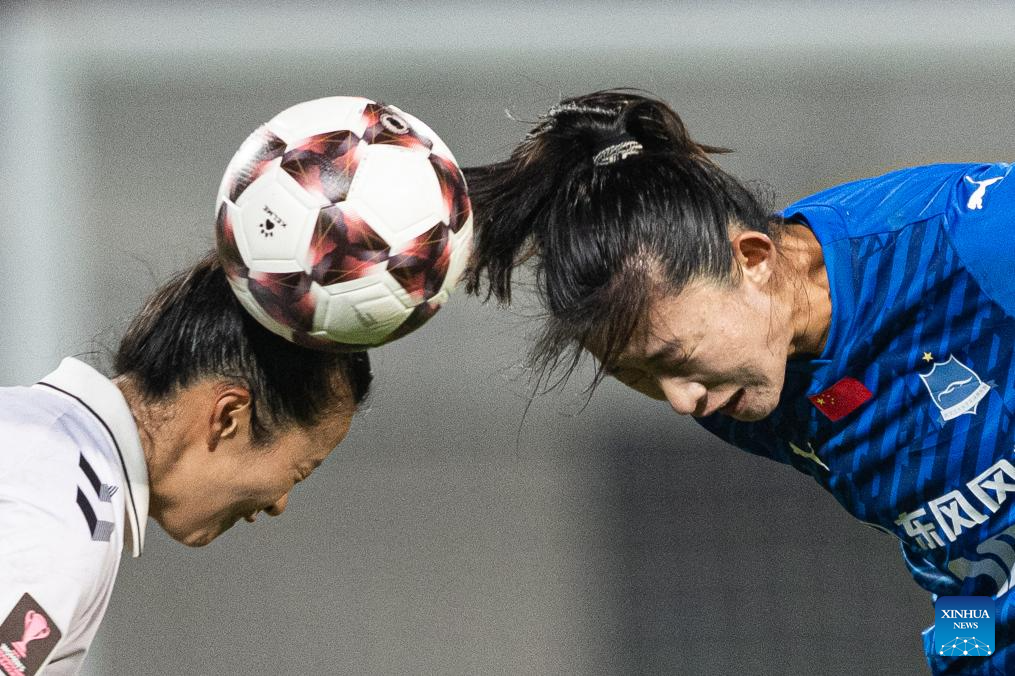 Choe Yuri (L) of Suwon FC Women vies for a header against Yao Wei of Wuhan Jiangda Women's FC during the quarterfinal match between Wuhan Jiangda Women's FC of China and Suwon FC Women of South Korea at the 2025/2026 AFC Women's Champions League in Wuhan, China, March 29, 2026. (Xinhua/Xiao Yijiu)