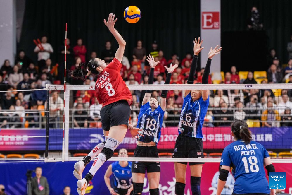 Wu Mengjie (1st L) of Jiangsu spikes the ball during the 1st-placed final 1st leg match between Jiangsu and Shanghai at the China Women's Volleyball League 2025-2026 in Changzhou, east China's Jiangsu Province, March 28, 2026. (Xinhua/Li Bo)