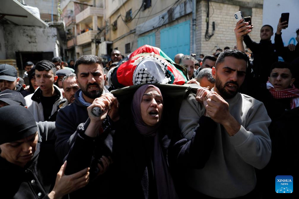 Palestinians attend a funeral of a teenager killed in an Israeli military operation in the Dheisheh refugee camp, south of the central West Bank city of Bethlehem, on March 28, 2026. (Photo by Mamoun Wazwaz/Xinhua)