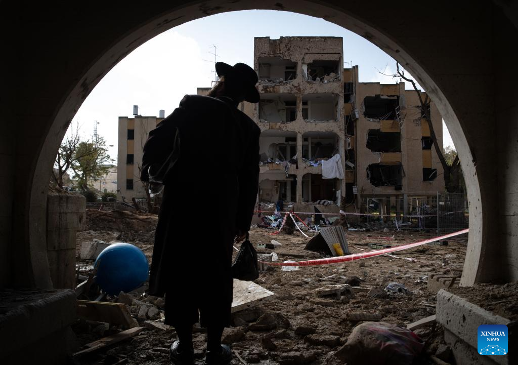 A man checks the debris of a building damaged after a missile strike in Arad, Israel, March 22, 2026. The U.S.-Israel-Iran conflict entered its 30th day on Sunday. The Middle East is once again caught in a cycle of escalating violence. Civilian casualties are mounting, regional tensions are intensifying, and the risk of a wider war grows by the day. (Xinhua/Chen Junqing)