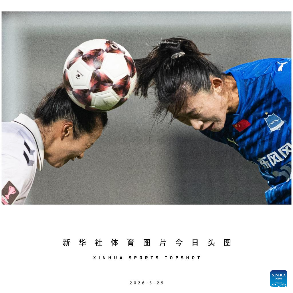 Choe Yuri (L) of Suwon FC Women vies for a header against Yao Wei of Wuhan Jiangda Women's FC during the quarterfinal match between Wuhan Jiangda Women's FC of China and Suwon FC Women of South Korea at the 2025/2026 AFC Women's Champions League in Wuhan, China, March 29, 2026. (Xinhua/Xiao Yijiu)