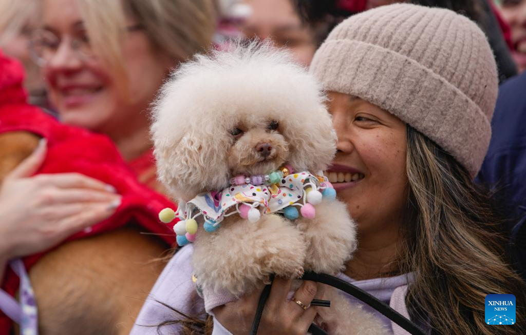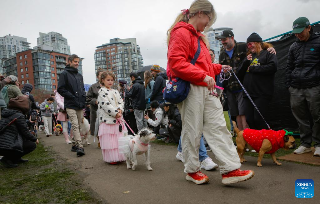 People and their dogs in costumes take part in a pet parade during the Vancouver Cherry Blossom Festival in Vancouver, British Columbia, Canada, on March 29, 2026. (Photo by Liang Sen/Xinhua)