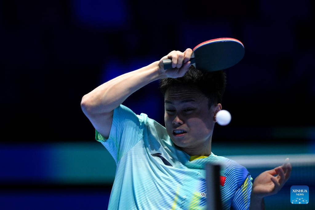Zhou Qihao hits a return during the men's singles group 16 match between Zhou Qihao of China and Kawakami Ryuusei of Japan at the ITTF Men's and Women's World Cup 2026 in Macao, China, March 30, 2026. (Xinhua/Cheong Kam Ka)