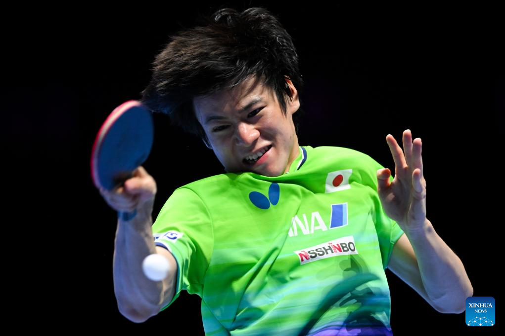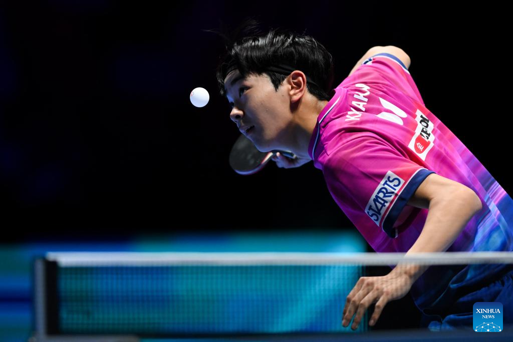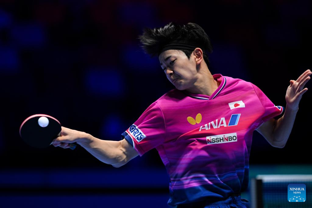 Togami Shunsuke of Japan hits a return during the men's singles group 14 match between Mak Tin Ian of China's Macao and Togami Shunsuke of Japan at the ITTF Men's and Women's World Cup 2026 in Macao, China, March 30, 2026. (Xinhua/Cheong Kam Ka)